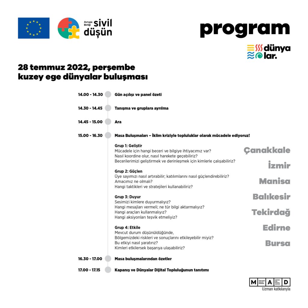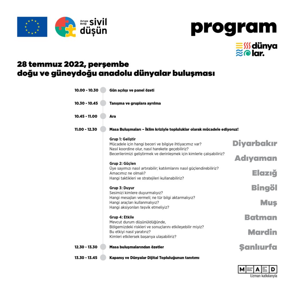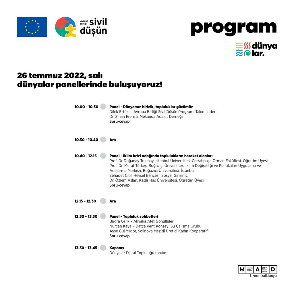 dünyalar, Temmuz 2022’den itibaren 12 ay boyunca, katkı sunmak isteyenlerle bu sorunun yanıtlarını keşfe çıkıyor. Süreç boyunca, dijital buluşmalar, kampanyalar, bir yüz yüze forum ve kapasite geliştirme eğitimleri hayata geçecek; yanı sıra kılavuz içerikler üretilecek, hakları koruyup yaşatmak için topluluk gücüyle gerçekleştiren çalışmalara özel Sivil Düşün desteği sunulacak. Mekanda Adalet Derneği (MAD), sürecin farklı aşamalarında, Sivil Düşün’e uzmanlık katkısı verecek.
