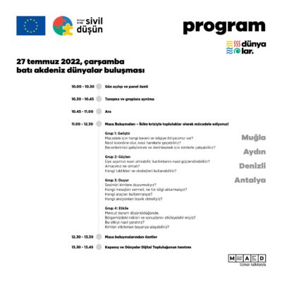 İklim kriziyle mücadelede topluluklar bize nasıl güç katar? Panel günü bu sorunun cevabını keşfetmek için kulağımız konuşmacılarda olacak. Devamında, yani 27-28 Temmuz’da ise Türkiye’nin dört farklı bölgesinden katılımcılar, kendileri konuşup tartışarak yeni soruların peşine düşecekler.