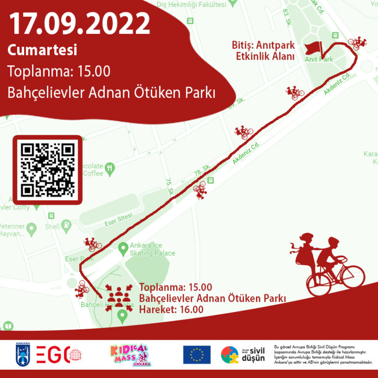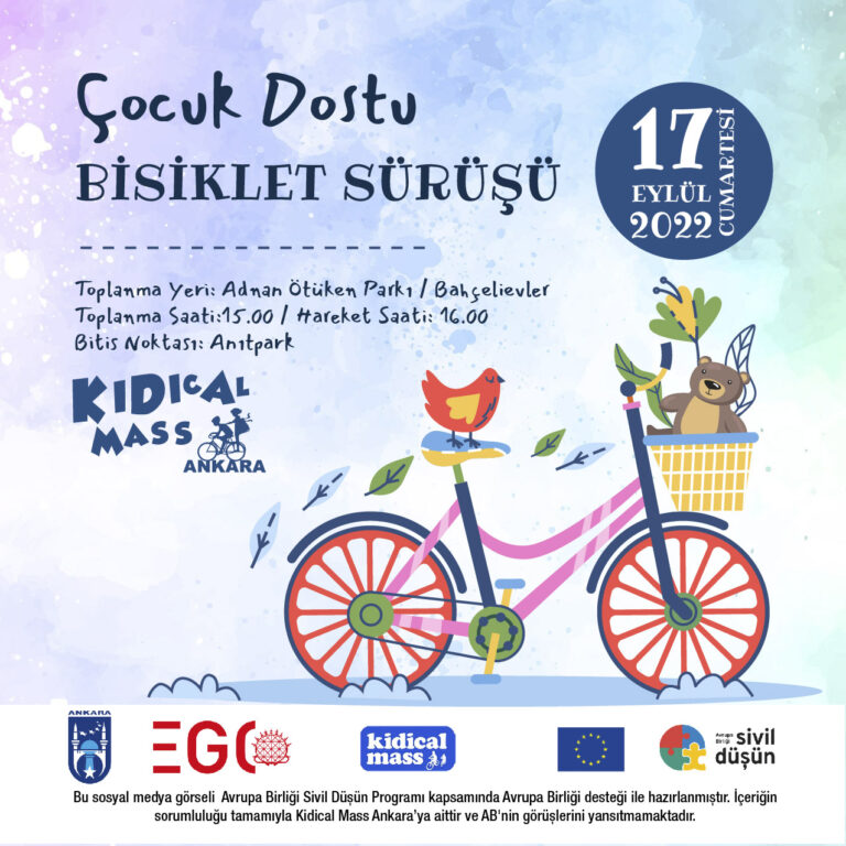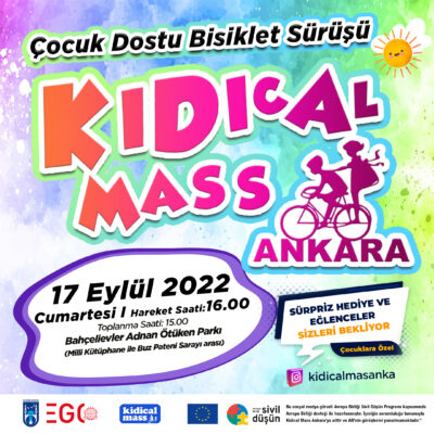 Kidical Mass’in tam da bu ihtiyaca karşılık gelecek şekilde tasarlanmış bir etkinlik modeli olduğunu keşfedince, diğer ülkelerde yapılan sürüş organizasyonlarını incelemeye başladık. Onlarla iletişime geçtik ve fikir paylaşımları yaptık. Türkiye’de ilk olarak 18 Eylül 2021 tarihinde Avrupa Hareketlilik Haftası kapsamında gerçekleştirdiğimiz Kidical Mass etkinliğini, Ankara Büyükşehir Belediyesi EGO Genel Müdürlüğünün ortak organizasyonu ve Sivil Düşün desteğiyle 17 Eylül 2022 Cumartesi günü üçüncü kez hayata geçirdik.